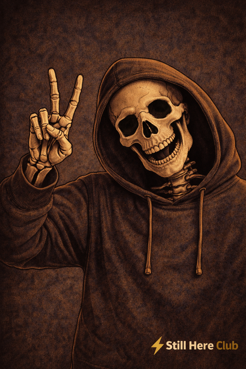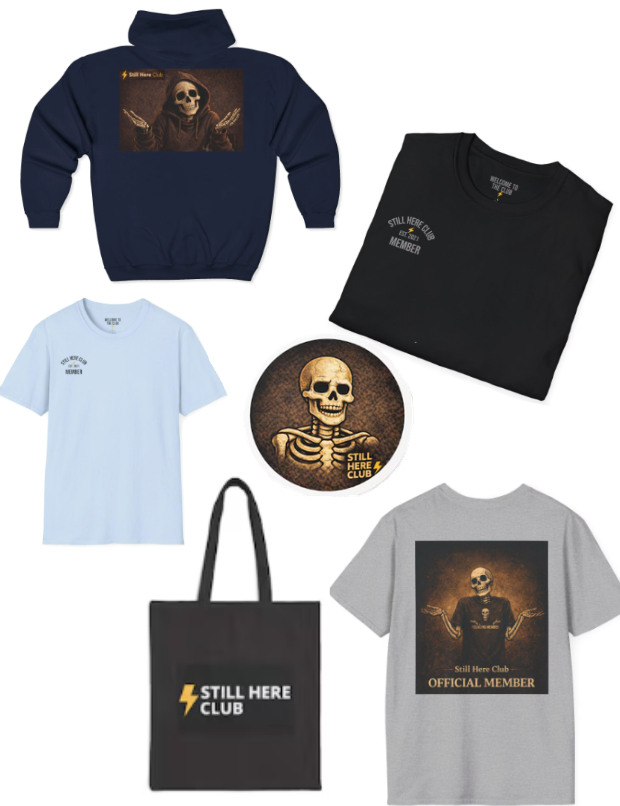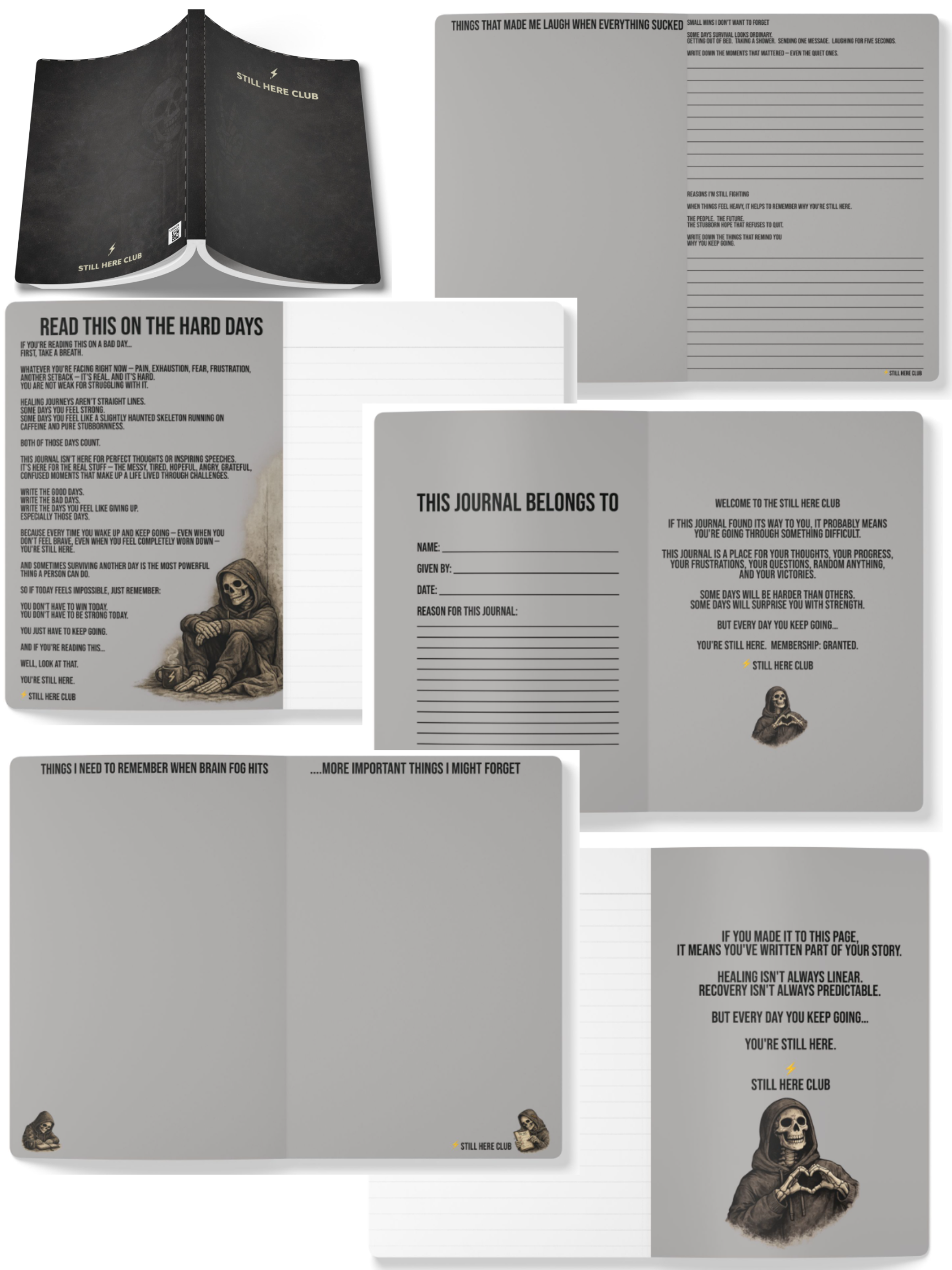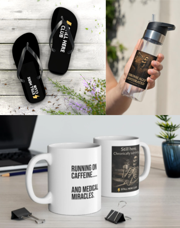 Still Here Club ⚡ exists to reduce stigma around chronic illness, disability, and medical trauma by creating space for honesty, resilience, and dark humor.